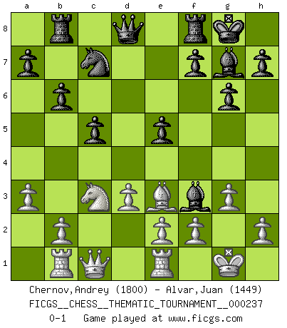 Last move : 0-1 2020 November 20 12:4:45 [Event "FICGS__CHESS__THEMATIC_TOURNAMENT__000237"] [Site "FICGS"] [Date "2020.08.13"] [Round "1"] [White "Chernov,Andrey"] [Black "Alvar,Juan"] [Result "0-1"] [WhiteElo "1800"] [BlackElo "1449"] 1.c4 Nf6 2.Nc3 c5 3.g3 d5 4.cxd5 Nxd5 5.Bg2 Nc7 6.Nf3 Nc6 7.O-O g6 8.d3 Bg7 9.Bd2 O-O 10.a3 b6 11.Rb1 Rb8 12.Re1 Bb7 13.Qc1 Nd4 14.Bf4 Nxf3+ 15.Bxf3 e5 16.Be3 Bxf3 0-1 Follow this game move after move (download)Chess is life. (Bobby Fischer) Schachspieler können ausgezeichnet Varianten am Schachbrett berechnen, aber nicht im realen Leben. Zu stark ist der Individualismus im Schach ausgeprägt, und für viele ist ein kleiner momentaner persönlicher Vorteil wichtiger als ein weit größerer Vorteil von morgen. (Anatoly Karpov) No es una movida, aún la mejor movida que tu debas buscar, sino un plan comprensible. (Eugene Znosko-Borovsky) Fischer est le meilleur joueur du monde et Karpov n'est qu'un joueur de bistrot. (Garry Kasparov, agé de 16 ans) You must do what you feel is right... of course. (Obi-Wan Kenobi in Star Wars ep.4)