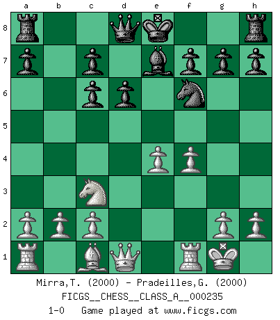 Last move : 1-0 2020 September 23 0:34:26 [Event "FICGS__CHESS__CLASS_A__000235"] [Site "FICGS"] [Date "2020.08.13"] [Round "1"] [White "Mirra,Theodore"] [Black "Pradeilles,Guillaume"] [Result "1-0"] [WhiteElo "2000"] [BlackElo "2000"] 1.e4 e5 2.Nf3 Nc6 3.Bb5 Nf6 4.O-O d6 5.d4 exd4 6.Nxd4 Bd7 7.Nc3 Be7 8.Nxc6 Bxc6 9.Bxc6+ bxc6 10.f4 1-0 This chess game has been lost on time (started : 2020.08.13 20:56:45) Ruy Lopez : Berlin defense, 4.O-O, d6 Kingside Castling by player White (move 4) Player White won this chess game. Follow this game move after move (download)We must make sure that Chess will not be like a dead language, very interesting, but for a very small group. (Sytze Faber) Den Ruhm habe ich schon, jetzt brauche ich noch das Geld. (Wilhelm Steinitz) Bobby Fischer es el jugador de Ajedrez mas grande que jamás haya existido. (Ken Smith) On peut tirer plus d'utilité d'une partie perdue que de 100 parties gagnées. (Capablanca) If I had no sense of humor, I would long ago have committed suicide. (Mahatma Gandhi)