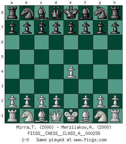 Last move : 1-0 2020 September 23 0:34:26 [Event "FICGS__CHESS__CLASS_A__000235"] [Site "FICGS"] [Date "2020.08.13"] [Round "1"] [White "Mirra,Theodore"] [Black "Merzliakov,Aleksandr"] [Result "1-0"] [WhiteElo "2000"] [BlackElo "2000"] 1.e4 1-0 This chess game has been lost on time (started : 2020.08.13 20:56:45) King's pawn Opening Player White won this chess game. Follow this game move after move (download)Chess is the art of analysis. (Mikhail Botvinnik) Wir irren allesamt, nur jeder irrt anders. (Georg Christoph Lichtenberg) Un Peón pasado aumenta su poder a medida de que el número de piezas en el tablero disminuye. (Capablanca) Karpov est une pièce de musée. (Garry Kasparov) If you are good, you will be assigned all the work. If you are really good, you will get out of it. (Dan Rotaru)