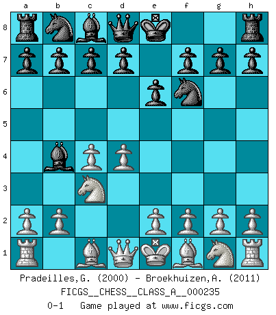 Last move : 0-1 2020 September 28 12:36:1 [Event "FICGS__CHESS__CLASS_A__000235"] [Site "FICGS"] [Date "2020.08.13"] [Round "1"] [White "Pradeilles,Guillaume"] [Black "Broekhuizen,A. T. S."] [Result "0-1"] [WhiteElo "2000"] [BlackElo "2011"] 1.d4 Nf6 2.c4 e6 3.Nc3 Bb4 0-1 This chess game has been lost on time (started : 2020.08.13 20:56:45) Nimzo-Indian defense Player Black won this chess game. Follow this game move after move (download)Via the squares on the chessboard, the Indians explain the movement of time and the age, the higher influences which control the world and the ties which link Chess with the human soul. (Al-Masudi) Charakterschwächen offenbaren sich normalerweise während einer Schachpartie. (Garry Kasparov) No hay precio que sea tan grande por la cabellera del Rey enemigo. (Koblentz) Donnez-moi un Cavalier en 6e et je gagnerais toutes mes parties. (Steinitz) Lottery : A tax on people who are bad at math. (Author unknown)