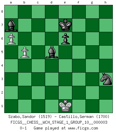 Last move : 0-1 2007 December 3 17:58:12 [Event "FICGS__CHESS__WCH_STAGE_1_GROUP_10__000003"] [Site "FICGS"] [Date "2007.07.11"] [Round "1"] [White "Szabo,Sandor"] [Black "Castillo,German"] [Result "0-1"] [WhiteElo "1519"] [BlackElo "1700"] 1.d4 d5 2.c4 dxc4 3.Nf3 Nf6 4.e3 e6 5.Bxc4 c5 6.O-O a6 7.dxc5 Qxd1 8.Rxd1 Bxc5 9.a3 b5 10.b4 Be7 11.Bd3 Bb7 12.Nbd2 O-O 13.Bb2 Nbd7 14.Rac1 Rac8 15.Nb3 Bd5 16.Nfd2 Bd6 17.f3 Rfd8 18.e4 Ba8 19.Rxc8 Rxc8 20.Nf1 Bb8 21.Kf2 Kf8 22.Ne3 h5 23.a4 Be5 24.axb5 Bxb2 25.bxa6 Nb6 26.b5 Ke7 27.h3 h4 28.Na5 Nfd7 29.Rb1 Nc5 30.Ke2 Nca4 31.Kf1 Rc5 32.Nd1 Be5 33.Nb3 Rc8 34.Ke2 Rd8 35.Rc1 Nd7 36.Rc4 Nab6 37.Rc1 Nf6 38.Bb1 Nh5 39.Nf2 Nf4+ 40.Kf1 Na4 41.Ng4 Bc3 42.Bc2 f6 43.Na1 Nb2 44.Bb3 Ba5 45.Nc2 Rd3 46.Ba2 Rc3 47.Nge3 Bb6 48.Rb1 Nbd3 49.Rb3 Rc8 50.Rb1 Ne5 51.Bb3 g6 52.Ra1 Rc3 53.Rb1 f5 54.exf5 gxf5 55.Ba4 Nxg2 56.Kxg2 f4 57.Rb3 Rxb3 58.Bxb3 fxe3 59.Kf1 Bxf3 60.Nxe3 Bxe3 61.Bc2 Ng4 62.Bd3 Nf2 63.Be2 Bd5 64.Bd3 Ba7 65.Ke2 Nxh3 66.Ke1 Nf4 67.Bf1 h3 68.Bxh3 Nxh3 0-1 QGA : Classical, 6...a6 Kingside Castling by player White (move 6) Kingside Castling by player Black (move 12) 10 pieces endgame at move 65 : White KBPP , Black KBBNPP WHITE : King + 1 Bishop 2 Pawns BLACK : King + 2 Bishops 1 Knight 2 Pawns 9 pieces endgame at move 68 : White KBPP , Black KBBNP WHITE : King + 1 Bishop 2 Pawns BLACK : King + 2 Bishops 1 Knight 1 Pawn 8 pieces endgame at move 68 : White KPP , Black KBBNP WHITE : King + 2 Pawns BLACK : King + 2 Bishops 1 Knight 1 Pawn Player Black won this chess game. Follow this game move after move (download)Chess is not like life... it has rules ! (Mark Pasternak) Weshalb minderdergeübte Spieler mit g2-g4 beginnen? Die betreffenden sind unschlüssig, ob sie nun rechts (h4) oder links (f4) beginnen sollen, und in ihrer Ratlosigkeit entschliessen sie sich nach guter Bürgerart dazu, den goldenen Mittelweg zu wählen. (Aaron Nimzowitsch) No puedes jugar al Ajedrez si eres de corazón noble. (Proverbio Francés) Psychologiquement, tu dois avoir confiance en toi même, mais cette confiance doit être basée sur des faits. (Robert Fischer) Only sick music makes money today. (Friedrich Nietzsche)