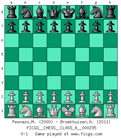 Last move : 0-1 2020 September 23 0:34:26 [Event "FICGS__CHESS__CLASS_A__000235"] [Site "FICGS"] [Date "2020.08.13"] [Round "1"] [White "Peonazo,Mirami"] [Black "Broekhuizen,A. T. S."] [Result "0-1"] [WhiteElo "2000"] [BlackElo "2011"] 0-1 This chess game has been lost on time (started : 2020.08.13 20:56:45) Player Black won this chess game. Follow this game move after move (download)Man is a frivolous, a specious creature, and like a Chess player, cares more for the process of attaining his goal than for the goal itself. (Dostoyevsky) Fischer ist das größte Genie, das je vom Schachhimmel heruntergestiegen ist. (Mikhail Nekhemyevich Tal) Si un gobernante no entiende al Ajedrez, ¿como puede governar él un reinado?. (El Rey Khusros II) On a dit que l'homme se distingue de l'animal par le fait qu'il achète plus de livres qu'il ne peut en lire. Je voudrais suggérer qu'inclure à la liste des livres quelques livres d'échecs rendrait la distinction manifeste. (Edward Lasker) I would love to change the world, but they won't give me the source code. (Unknown)