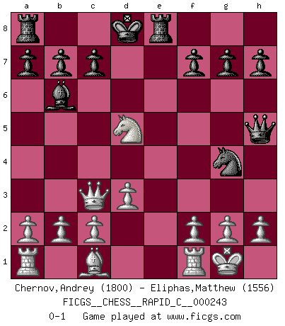 Last move : 0-1 2020 October 24 10:56:2 [Event "FICGS__CHESS__RAPID_C__000243"] [Site "FICGS"] [Date "2020.08.15"] [Round "1"] [White "Chernov,Andrey"] [Black "Eliphas,Matthew"] [Result "0-1"] [WhiteElo "1800"] [BlackElo "1556"] 1.e4 e5 2.Nf3 Nc6 3.Be2 Bc5 4.Nxe5 Qh4 5.O-O Qxe4 6.Nxc6 Qxc6 7.Bf3 Qg6 8.Nc3 Nf6 9.Nb5 Bb6 10.Qe1+ Kd8 11.d3 d5 12.Nc3 Bg4 13.Bxg4 Nxg4 14.Nxd5 Re8 15.Qc3 Qh5 0-1 This chess game has been lost on time (started : 2020.08.15 14:54:55) Inverted Hungarian Kingside Castling by player White (move 5) Player Black won this chess game. Follow this game move after move (download)Castle early and often. (Rob Sillars) Je mehr wir mit Computern analysieren, desto mehr glauben wir an Verteidigung. (Vladimir Kramnik) Personalmente, yo prefiero mirar hacia el futuro en donde un programa de computadora gane el título mundial de Ajedrez. La humanidad necesita una lección de humildad. (Richard Dawkings) Les Echecs sont et restent toujours un combat, un combat intégral comme la boxe, la lutte ou un autre sport, et où il doit y avoir un vainqueur et un vaincu. (Joseph Emil Diemer) 'preceded by its own quotation yields a falsehood' preceded by its own quotation yields a falsehood. (W. V. O. Quine - Set Theory And Its Logic, 1953)