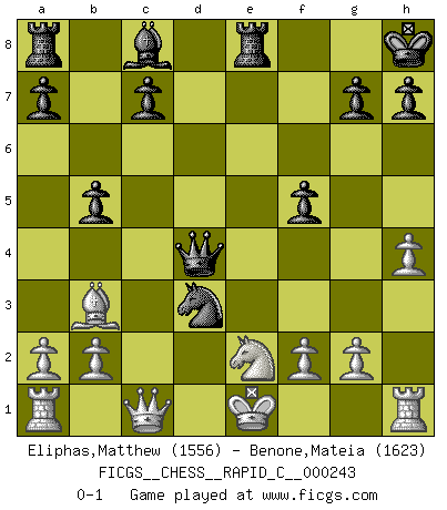 Last move : 0-1 2020 September 7 4:39:37 [Event "FICGS__CHESS__RAPID_C__000243"] [Site "FICGS"] [Date "2020.08.15"] [Round "1"] [White "Eliphas,Matthew"] [Black "Benone,Mateia"] [Result "0-1"] [WhiteElo "1556"] [BlackElo "1623"] 1.d4 d5 2.Bf4 Nc6 3.e3 e6 4.Nd2 Nf6 5.Bd3 Bd6 6.Bxd6 Qxd6 7.c3 O-O 8.e4 dxe4 9.Nxe4 Nxe4 10.Bxe4 f5 11.Bd3 e5 12.Bc4+ Kh8 13.h4 exd4 14.cxd4 Qxd4 15.Qc2 Re8+ 16.Ne2 b5 17.Bb3 Nb4 18.Qc1 Nd3+ 0-1 Queen's pawn, Mason variation Kingside Castling by player Black (move 7) Player Black won this chess game. Follow this game move after move (download)Why must I lose to this idiot ? (Aron Nimzovich) Der Vorposten provoziert a) eine Basis für neue Angriffe und b) eine Schwächung der gegnerischen Widerstandskraft in der fraglichen Linie. (Aaron Nimzowitsch) Es el objetivo de la escuela moderna no tratar cada posición de acuerdo a una regla general, sino de acuerdo al principio inherente en la posición. (Richard Reti) Je ne crois pas en la psychologie, je crois aux bons coups. (Robert Fischer) If you don't practice you don't deserve to win. (Andre Agassi)
