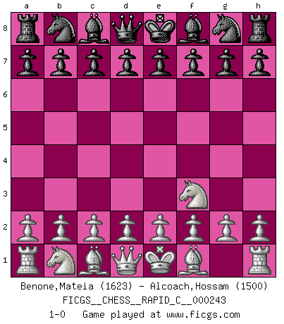 Last move : 1-0 2020 September 14 19:17:15 [Event "FICGS__CHESS__RAPID_C__000243"] [Site "FICGS"] [Date "2020.08.15"] [Round "1"] [White "Benone,Mateia"] [Black "Alcoach,Hossam"] [Result "1-0"] [WhiteElo "1623"] [BlackElo "1500"] 1.Nf3 1-0 This chess game has been lost on time (started : 2020.08.15 14:54:55) Reti Opening Player White won this chess game. Follow this game move after move (download)Could we look into the head of a Chess player, we should see there a whole world of feelings, images, ideas, emotion and passion. (Alfred Binet) Matt entspricht nicht immer den Tatsachen. (Savielly Grigorievitsch Tartakower) Si tu oponente no puede hacer nada activo, entonces no apures la posición; En vez de eso, dejalo estar sentado ahí, sufriendo y rogandote por un empate. (Jeremy Silman) Botvinnik disait en comparant les échecs à la musique: Il existe une science dont le but est l'étude de l'acoustique et des sons. Mais il y a aussi un art qui se sert de l'océan des sons : c'est la musique. De toute évidence, il en est de même pour la pensée. La logique est l'étude des lois de la réflexion et les échecs reflètent, en tant qu'art, le côté logique de la réflexion, sous la forme d'images artistiques... Extrait de Fischer - Spassky, Reykjavik 1972 par Alexander & F. Wyndham (Ed. Solar), p 37. Beta. Software undergoes beta testing shortly before it's released. Beta is latin for still doesn't work. (Anonymous)