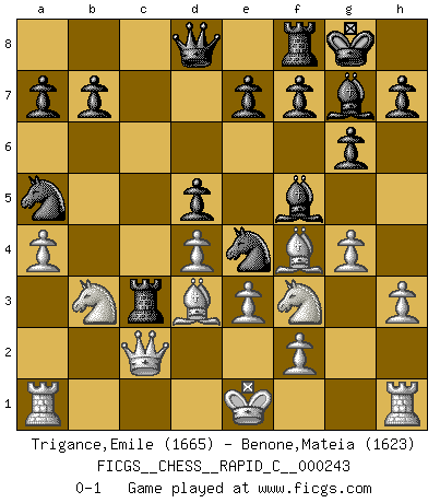 Last move : 0-1 2020 August 31 9:18:25 [Event "FICGS__CHESS__RAPID_C__000243"] [Site "FICGS"] [Date "2020.08.15"] [Round "1"] [White "Trigance,Emile"] [Black "Benone,Mateia"] [Result "0-1"] [WhiteElo "1665"] [BlackElo "1623"] 1.d4 d5 2.Nf3 Nf6 3.Bf4 g6 4.e3 Bg7 5.h3 O-O 6.Be2 c5 7.c3 c4 8.Nbd2 Nc6 9.a4 Na5 10.b3 cxb3 11.Nxb3 Ne4 12.Qc2 Bf5 13.g4 Rc8 14.Bd3 Rxc3 0-1 Queen's Bishop game Kingside Castling by player Black (move 5) Player Black won this chess game. Follow this game move after move (download)Chess, like love, is infectious at any age. (Flohr) Mein erstes Ziel war nicht, die Partie zu gewinnen, sondern eine Figur zu opfern. -- der junge (Wilhelm Steinitz) El ganar no lo es todo... pero el perder es nada. (Mednis) La vérité est comme le meilleur coup aux échecs : elle existe, mais il faut la chercher. (Arturo Perez-Reverte) Pretend inferiority and encourage his arrogance. (Sun Tzu)