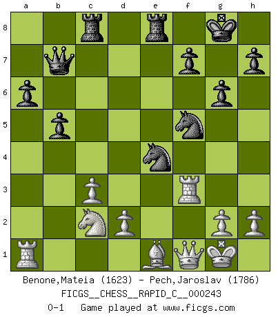 Last move : 0-1 2020 November 24 19:5:52 [Event "FICGS__CHESS__RAPID_C__000243"] [Site "FICGS"] [Date "2020.08.15"] [Round "1"] [White "Benone,Mateia"] [Black "Pech,Jaroslav"] [Result "0-1"] [WhiteElo "1623"] [BlackElo "1786"] 1.e4 c5 2.b4 cxb4 3.a3 d5 4.exd5 Qxd5 5.Nf3 e5 6.axb4 Bxb4 7.c3 Bd6 8.Be2 e4 9.Nd4 Ne7 10.Nb5 O-O 11.Nxd6 Qxd6 12.Ba3 Qd8 13.f3 Bf5 14.O-O exf3 15.Bxf3 Bd3 16.Be2 Nbc6 17.Bxd3 Qxd3 18.Qb3 Nd4 19.Qd1 Rfe8 20.Bc5 Ne6 21.Rf3 Qd5 22.Be3 Nf5 23.Bf2 b5 24.Qf1 Ng5 25.Rd3 Qb7 26.Na3 Ne4 27.Be1 g6 28.Rf3 a6 29.Nc2 Rac8 0-1 Follow this game move after move (download)Spassky will not be psyched out by Fischer. (Mike Goodall) Ich spiele ehrlich und spiele, um zu gewinnen. Wenn ich verliere nehme ich meine Medizin. (Robert James Fischer) Los asuntos humanos son como una partida de Ajedrez: solo aquellos que no lo toman seriamente, pueden ser llamados buenos jugadores. (Hung Tzu Ch'eng) Nous sommes les pions de la mystérieuse partie d'Echecs jouée par Dieu. Il nous déplace, nous arrête, nous pousse encore, puis nous lance un à un dans la boîte du Néant. Epitaphe sur la tombe de David Janowsky (1868-1927). Humor is by far the most significant activity of the human brain. (Edward De Bono)