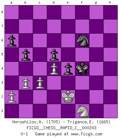 Last move : 0-1 2020 November 29 18:17:18 [Event "FICGS__CHESS__RAPID_C__000243"] [Site "FICGS"] [Date "2020.08.15"] [Round "1"] [White "Horoshilov,Andrey"] [Black "Trigance,Emile"] [Result "0-1"] [WhiteElo "1705"] [BlackElo "1665"] 1.Nc3 d5 2.d4 Nf6 3.Bf4 c5 4.e3 a6 5.Nf3 Bg4 6.Be2 Bxf3 7.Bxf3 cxd4 8.exd4 e6 9.O-O Bd6 10.Bxd6 Qxd6 11.h3 Nbd7 12.Qe2 O-O 13.Qe3 b5 14.Ne2 Rac8 15.c3 Nb6 16.Qf4 Nc4 17.Qxd6 Nxd6 18.b3 Rc7 19.g4 h6 20.Kh2 Nh7 21.h4 Ne4 22.Bxe4 dxe4 23.f4 f5 24.Rg1 fxg4 25.Rxg4 Nf6 26.Rg2 Nh5 27.Rf1 Rcf7 28.Rgf2 g5 29.hxg5 hxg5 30.Rg1 Rg7 31.Rfg2 Rf5 32.fxg5 Rf3 33.g6 Rd7 34.Rg5 Rd5 35.Rxd5 exd5 36.Kg2 Kg7 37.Rf1 Rxf1 38.Kxf1 Kxg6 39.Kg2 Kf5 40.Kf2 Nf6 41.Nc1 Kf4 42.Ne2+ Kf5 43.Ke3 Ng4+ 44.Kd2 Nf6 45.Ng3+ Kf4 46.Nf1 Ng4 47.Ke2 Nf6 0-1 This chess game has been lost on time (started : 2020.08.15 14:54:55) Follow this game move after move (download)Chess is ruthless: you've got to be prepared to kill people. (Nigel Short) Sitze auf Deine Hände. (Siegbert Tarrasch) Los Peones son nacidos libres, y aún así, se encuentran por doquier encadenados. (Rick Kennedy) Aux échecs, l'amour-propre est satisfait quand on remporte la victoire, mais il n'y a pas de honte à être battu. (Benjamin Franklin) If we don't succeed, we run the risk of failure. (George W. Bush)