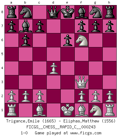 Last move : 1-0 2020 August 27 16:39:7 [Event "FICGS__CHESS__RAPID_C__000243"] [Site "FICGS"] [Date "2020.08.15"] [Round "1"] [White "Trigance,Emile"] [Black "Eliphas,Matthew"] [Result "1-0"] [WhiteElo "1665"] [BlackElo "1556"] 1.d4 e6 2.e4 d5 3.Nc3 dxe4 4.Nxe4 b6 5.Qf3 Bb7 6.Nf6+ 1-0 Queen's pawn Player White won this chess game. Follow this game move after move (download)The game of chess is the touchstone of the intellect. (Goethe) Obwohl ich alt bin, darf mir niemand den Finger in den Mund stecken, sonst beisse ich. (Wilhelm Steinitz) Yo tuve un dolor de muelas en la primer partida. En el segundo juego, tuve un dolor de cabeza. En el tercero, tuve un ataque de reumatísmo. En la cuarta partida, no me sentía muy bien. ¿Y en el quinto juego? Bueno, ¿que acaso uno tiene que ganar todos los juegos?. (Siegbert Tarrasch) L'attaque fait le spectacle, la défense gagne les matchs. (Dicton footballistique) It is not true that people stop pursuing dreams because they grow old, they grow old because they stop pursuing dreams. (Gabriel Garcia Marquez)