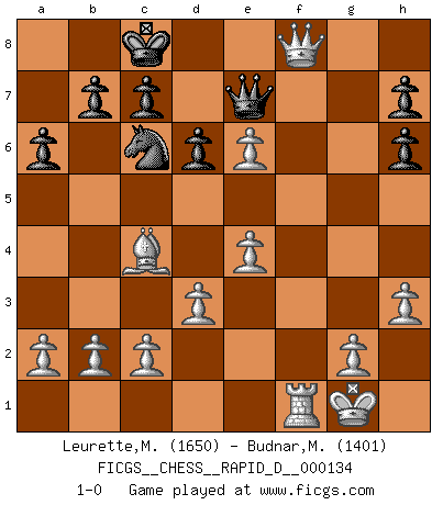 Last move : 1-0 2020 September 12 7:41:30 [Event "FICGS__CHESS__RAPID_D__000134"] [Site "FICGS"] [Date "2020.08.15"] [Round "1"] [White "Leurette,Marc-Antoine"] [Black "Budnar,Milos"] [Result "1-0"] [WhiteElo "1650"] [BlackElo "1401"] 1.e4 e5 2.Nf3 Nc6 3.Bc4 d6 4.Nc3 Bg4 5.h3 Bh5 6.d3 Bxf3 7.Qxf3 Qf6 8.Qd1 O-O-O 9.O-O a6 10.f4 Nh6 11.fxe5 Qe7 12.Bxh6 gxh6 13.Rxf7 Qg5 14.Nd5 Rd7 15.Qf3 Rxf7 16.Qxf7 Qd8 17.e6 Be7 18.Rf1 Rf8 19.Nxe7+ Qxe7 20.Qxf8+ 1-0 King's pawn game Queenside Castling by player Black (move 8) Kingside Castling by player White (move 9) Player White won this chess game. Follow this game move after move (download)Capture of the adverse King is the ultimate but not the first object of the game. (William Steinitz) Die Auseinandersetzung mit Karpow war politisch geprägt. Er stand für das kommunistische System, wurde von dessen Repräsentanten gehätschelt. Ich war der Oppositionelle. Jeder Schachweltmeister spiegelt auch die gesellschaftlichen Verhältnisse wider. Kramnik steht für die Börsen-Generation des Neuen Markts, ideologiefrei, zahlenfixiert. (Garry Kasparov) Es el objetivo de la escuela moderna no tratar cada posición de acuerdo a una regla general, sino de acuerdo al principio inherente en la posición. (Richard Reti) C'est la seule position que je connaisse où les deux camps sont mals. Propos prêtés à V. Anand. A clear conscience is usually the sign of a bad memory. (Unknown)