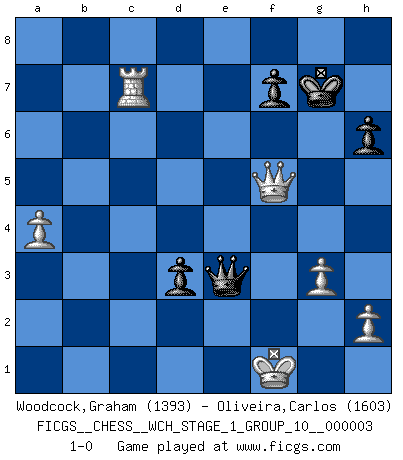 Last move : 1-0 2007 November 6 20:14:47 [Event "FICGS__CHESS__WCH_STAGE_1_GROUP_10__000003"] [Site "FICGS"] [Date "2007.07.11"] [Round "1"] [White "Woodcock,Graham"] [Black "Oliveira,Carlos"] [Result "1-0"] [WhiteElo "1393"] [BlackElo "1603"] 1.d4 d5 2.c4 e6 3.Nf3 c6 4.c5 b6 5.b4 a5 6.Qa4 Bb7 7.Be3 axb4 8.Qxb4 Nd7 9.Nbd2 Ngf6 10.g3 Qc8 11.Bh3 Be7 12.Qc3 bxc5 13.dxc5 O-O 14.O-O Ba6 15.Rfe1 Qc7 16.a4 e5 17.Bg5 h6 18.Bxf6 Bxf6 19.Bxd7 Qxd7 20.Nxe5 Qf5 21.f4 Rfe8 22.Ndf3 g5 23.Nd4 Qh3 24.Ndxc6 gxf4 25.Ra3 Bb7 26.Qd2 Bxe5 27.Nxe5 Rxe5 28.Qxf4 d4 29.Rf3 Bxf3 30.Qxf3 Rf5 31.Qxa8+ Kg7 32.c6 Rf6 33.c7 Qf5 34.Rc1 Qf2+ 35.Kh1 Qxe2 36.Qg2 Rf2 37.Qxf2 Qxf2 38.c8Q Qf3+ 39.Kg1 Qe3+ 40.Kg2 Qe2+ 41.Kh3 Qh5+ 42.Kg2 Qe2+ 43.Kg1 Qe3+ 44.Kf1 d3 45.Qg4+ Kh7 46.Qf5+ Kg7 47.Rc7 1-0 Queen's gambit declined Kingside Castling by player Black (move 13) Kingside Castling by player White (move 14) Promotion Queen by player White (move 38) Player White won this chess game. Follow this game move after move (download)If I win a tournament, I win it by myself. I do the playing. Nobody helps me. (Bobby Fischer) Schach ist mein Leben, meine Leidenschaft, was ich gelernt habe und seit meinem 14. Lebensjahr profimässig praktiziere. Darauf zu verzichten, würde mir sehr schwer fallen. (Viktor Kortschnoi) Algunos sacrificios son sólidos, los demás son míos. (Mikhail Tal) En blitz, le Cavalier l'emporte sur le Fou. (Vlastimil Hort) Success without honor is an unseasoned dish; it will satisfy your hunger, but it won't taste good. (Joe Paterno)