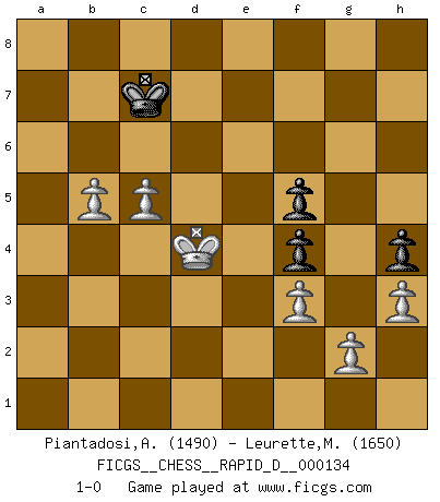Last move : 1-0 2020 October 21 9:1:0 [Event "FICGS__CHESS__RAPID_D__000134"] [Site "FICGS"] [Date "2020.08.15"] [Round "1"] [White "Piantadosi,Angelo"] [Black "Leurette,Marc-Antoine"] [Result "1-0"] [WhiteElo "1490"] [BlackElo "1650"] 1.e4 e5 2.Nf3 Nc6 3.Bb5 a6 4.Bxc6 bxc6 5.O-O d6 6.d4 exd4 7.Nxd4 c5 8.Nf3 Nf6 9.Nc3 Bb7 10.Re1 Be7 11.e5 dxe5 12.Nxe5 O-O 13.Bg5 Qxd1 14.Raxd1 h6 15.Bh4 Rae8 16.Bxf6 Bxf6 17.Nd7 Rxe1+ 18.Rxe1 Rd8 19.Nxf6+ gxf6 20.f3 Kf8 21.Kf2 Rd2+ 22.Re2 Rxe2+ 23.Kxe2 Kg7 24.Ke3 f5 25.Kf4 Kg6 26.Ke5 Bc6 27.Nd5 Bxd5 28.Kxd5 f4 29.Kc6 f5 30.Kxc5 Kg5 31.Kc6 h5 32.Kxc7 h4 33.h3 Kf6 34.c4 Ke6 35.Kc6 Ke5 36.Kc5 a5 37.b3 Ke6 38.Kd4 Kd6 39.a3 Ke6 40.b4 axb4 41.axb4 Kd6 42.b5 Kc7 43.c5 1-0 Ruy Lopez : Exchange variation Kingside Castling by player White (move 5) Kingside Castling by player Black (move 12) 10 pieces endgame at move 41 : White KPPPPP , Black KPPP WHITE : King + 5 Pawns BLACK : King + 3 Pawns Player White won this chess game. Follow this game move after move (download)He who takes the Queen's Knight's Pawn will sleep in the streets. (Anonymous) Die Neutralität betrachte ich als eine schwere Krankheit. (Viktor Kortschnoi) Tu no necesitas jugar muy bien, únicamente ayudar a tu oponenet a que juegue muy mal. (Genrikh Chepukaitis) Il (Jacob Murray) ne joue pas pour le bon coup, mais pour le meilleur. (Eloi Relange) He who defends everything defends nothing. (Frederick the Great)