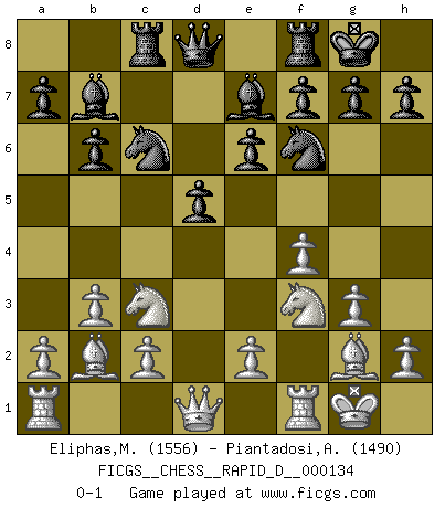 Last move : 0-1 2020 October 10 16:38:23 [Event "FICGS__CHESS__RAPID_D__000134"] [Site "FICGS"] [Date "2020.08.15"] [Round "1"] [White "Eliphas,Matthew"] [Black "Piantadosi,Angelo"] [Result "0-1"] [WhiteElo "1556"] [BlackElo "1490"] 1.d4 d5 2.f4 e6 3.Nf3 Nf6 4.g3 c5 5.b3 Nc6 6.Bb2 Be7 7.dxc5 Bxc5 8.Nc3 O-O 9.Bg2 b6 10.Na4 Be7 11.O-O Bb7 12.Nc3 Rc8 0-1 This chess game has been lost on time (started : 2020.08.15 15:33:6) Queen's pawn game Kingside Castling by player Black (move 8) Kingside Castling by player White (move 11) Player Black won this chess game. Follow this game move after move (download)A great player and a great example for many. His book My 60 Memorable Games had a big impact on me. It is a shame he didn't continue to enrich the world of chess with his unparalleled understanding after 1972. (Jan Timman, about Bobby Fischer's death) Nach Morphy wurde nichts neues mehr in der Behandlung offener Positionen gefunden. (Mikhail Moiseyevich Botvinik) El hombre es un frívolo, una creatura engañosa y como un jugador de Ajedrez, se preocupa mas por el proceso de obtener su meta que de la meta por sí misma. (Dostoyevsky) A chaque perte on perd un peu de soi. (Joël Lautier) There are 10 types of people in this world: those who understand binary and those who don't. (Anonymous)