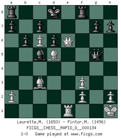 Last move : 1-0 2020 September 1 12:23:5 [Event "FICGS__CHESS__RAPID_D__000134"] [Site "FICGS"] [Date "2020.08.15"] [Round "1"] [White "Leurette,Marc-Antoine"] [Black "Pintor,Manuel"] [Result "1-0"] [WhiteElo "1650"] [BlackElo "1496"] 1.e4 e5 2.Nf3 Nc6 3.Bc4 Bc5 4.c3 Qf6 5.b4 Bb6 6.d4 exd4 7.cxd4 Nxd4 8.Nxd4 Bxd4 9.O-O Bxa1 10.Nd2 d6 11.Re1 Ne7 12.Nf3 Bg4 13.Bg5 Qc3 14.Bb3 f6 15.Bd2 Bxf3 16.gxf3 Qd4 17.Qc1 Bb2 18.Qc2 Ba3 19.Rb1 Qb6 20.Ba4+ Nc6 21.Be3 Qa6 22.b5 Qa5 23.bxc6 b6 24.Bb3 Rf8 25.Bd5 Bc5 26.Bd2 Qa6 27.Be1 Qc8 28.Kg2 f5 29.Bc3 Qd8 30.exf5 Qg5+ 31.Kh1 Qxf5 32.Qe2+ Kd8 33.Re1 Qg5 34.Qe6 1-0 Giuoco Piano Kingside Castling by player White (move 9) Player White won this chess game. Follow this game move after move (download)The only thing Chess players have in common is Chess. (Lodewijk Prins) Ich bewundere Kasparows phantasievolle Angriffssiege aus den Achtzigern und Neunzigern, aber wenn man sie mit dem Computer überprüft, nimmt der Computer in jeder zweiten Partie die Opfer an, verteidigt sich und gewinnt. (Vladimir Kramnik) Bobby Fischer es el mas grande genio de Ajedrez de todos los tiempos. (Alexander Kotov) Plusieurs personnes se sont demandées comment Tal faisait pour gagner... En fait, c'est très simple ! Il met ses pièces au centre de l'échiquier et les sacrifie quelque part ! (David Bronstein) The existence of forgetting has never been proved: We only know that some things don't come to mind when we want them. (Friedrich Nietzsche)