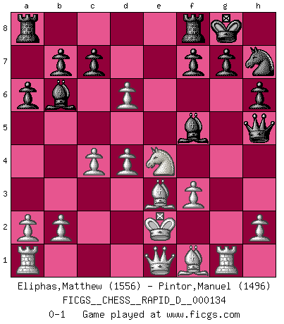 Last move : 0-1 2020 October 5 22:38:31 [Event "FICGS__CHESS__RAPID_D__000134"] [Site "FICGS"] [Date "2020.08.15"] [Round "1"] [White "Eliphas,Matthew"] [Black "Pintor,Manuel"] [Result "0-1"] [WhiteElo "1556"] [BlackElo "1496"] 1.e4 e5 2.Nc3 Bc5 3.f4 Nc6 4.Nf3 Qf6 5.d3 h6 6.fxe5 Nxe5 7.d4 Nxf3+ 8.gxf3 Qh4+ 9.Ke2 Bb6 10.Be3 Nf6 11.Qe1 Qh5 12.e5 Nh7 13.Ne4 O-O 14.c4 a6 15.Rg1 d6 16.exd6 Bf5 0-1 This chess game has been lost on time (started : 2020.08.15 15:33:6) Vienna game Kingside Castling by player Black (move 13) Player Black won this chess game. Follow this game move after move (download)If Chess is a science, it's a most inexact one. If Chess is an art, it is too exacting to be seen as one. If Chess is a sport, it's too esoteric. If Chess is a game, it's too demanding to be just a game. If Chess is a mistress, she's a demanding one. If Chess is a passion, it's a rewarding one. If Chess is life, it's a sad one. (Unknown) Der Vorposten provoziert a) eine Basis für neue Angriffe und b) eine Schwächung der gegnerischen Widerstandskraft in der fraglichen Linie. (Aaron Nimzowitsch) Es el objetivo de la escuela moderna no tratar cada posición de acuerdo a una regla general, sino de acuerdo al principio inherente en la posición. (Richard Reti) On est toujours la mazette de quelqu'un d'autre. (Anonyme) A good book on your shelf is a friend that turns its back on you and remains a friend. (Author unknown)