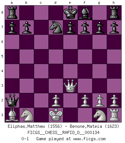 Last move : 0-1 2020 August 29 21:29:17 [Event "FICGS__CHESS__RAPID_D__000134"] [Site "FICGS"] [Date "2020.08.15"] [Round "1"] [White "Eliphas,Matthew"] [Black "Benone,Mateia"] [Result "0-1"] [WhiteElo "1556"] [BlackElo "1623"] 1.e4 c5 2.a3 Nc6 3.b4 cxb4 4.axb4 Nxb4 5.Bb2 d5 6.Qf3 Nxc2+ 7.Kd1 Nxa1 8.Bxa1 Nf6 9.exd5 Qxd5 10.Qe3 Qa2 11.Bb5+ Bd7 12.Bxd7+ Nxd7 0-1 Sicilian defense Player Black won this chess game. Follow this game move after move (download)I'm not a materialistic person, in that, I don't suffer the lack or loss of money. The absence of worldly goods I don't look back on. For Chess is a way I can be as materialistic as I want without having to sell my soul. (Jamie Walter Adams) Wenn ich einen Club besuche, sind die Spieler stumm vor Staunen. (José Raúl Capablanca) En posiciones complicadas, Bobby Fischer pocas veces tuvo que temer de cualquiera. (Paul Keres) Les échecs c'est le défi de l'alpiniste, toujours plus haut, prêt à tout pour monter à l'assaut du Roi ennemi. Les échecs, c'est de la musique en mouvement, un ballet majestueux pour les yeux. C'est de la poésie composée par les fantômes du passé qui au même titre que Rimbaud ou Verlaine méritent notre admiration. Les échecs, c'est de la peinture ou le moindre mouvement modifie le tableau pour en faire un Picasso ou un Van Gogh. Les échecs, c'est tout et rien, c'est la vie et la mort. Jjulie33 sur le forum de France-Echecs. They misunderestimated me. (George W. Bush, Bentonville nov. 6, 2000)