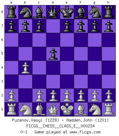 Last move : 0-1 2020 September 26 10:49:52 [Event "FICGS__CHESS__CLASS_E__000234"] [Site "FICGS"] [Date "2020.08.16"] [Round "1"] [White "Puzanov,Vasyl"] [Black "Hadden,John"] [Result "0-1"] [WhiteElo "1228"] [BlackElo "1201"] 1.b4 d5 0-1 This chess game has been lost on time (started : 2020.08.16 17:16:50) Polish (Sokolsky) opening Player Black won this chess game. Follow this game move after move (download)I know people who have all the will in the world, but still can't play good Chess. (Bobby Fischer) Ich war zu klein für die Schach-Schülermannschaft! (Woody Allen) No soy una persona materialista y por eso, no resiento la falta o pérdida del dinero. La ausencia de cosas mundanas carece de importancia. Ya que el Ajedrez es una forma en la que puedo ser tan materialista como yo desee sin tener la necesidad de vender mi alma. (Jamie Walter Adams) On n'a jamais que l'âge auquel on a commence à jouer aux échecs car après on cesse de vieillir. (Capablanca) The Internet is so big, so powerful and pointless that for some people it is a complete substitute for life. (Andrew Brown)