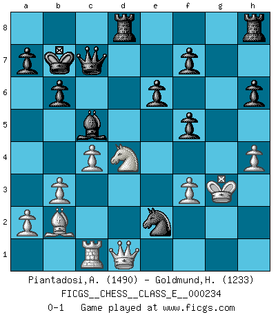 Last move : 0-1 2020 October 1 1:4:5 [Event "FICGS__CHESS__CLASS_E__000234"] [Site "FICGS"] [Date "2020.08.16"] [Round "1"] [White "Piantadosi,Angelo"] [Black "Goldmund,Heike"] [Result "0-1"] [WhiteElo "1490"] [BlackElo "1233"] 1.e4 d5 2.exd5 Qxd5 3.Nc3 Qa5 4.d4 Nf6 5.Bd2 c6 6.Ne4 Qc7 7.Nxf6+ gxf6 8.Nf3 Nd7 9.Be2 e6 10.O-O Bd6 11.c4 b6 12.Rc1 Bb7 13.Re1 O-O-O 14.Bc3 c5 15.b3 f5 16.g3 h6 17.dxc5 Nxc5 18.Nd4 Ne4 19.Bb2 Bc5 20.Bf3 Ng5 21.Bxb7+ Kxb7 22.h4 Ne4 23.f3 Nxg3 24.Kg2 Nh5 25.Re2 Nf4+ 26.Kg3 Nxe2+ 0-1 Scandinavian (centre counter) defense Kingside Castling by player White (move 10) Queenside Castling by player Black (move 13) Player Black won this chess game. Follow this game move after move (download)We don't really know how the game was invented, though there are suspicions. As soon as we discover the culprits, we'll let you know. (Bruce Pandolfini) Rauchen ist dem Schachspieler bei seiner Arbeit, also im Wettkampf, untersagt. (Viktor Kortschnoi) No todos los artistas son jugadores de Ajedrez, pero todos los jugadores de Ajedrez son artistas. (Marcel Duchamp) Un millionnaire : 'Monsieur Steinitz ! Vous ne participez aux tournois que pour l'argent, alors que moi je n'y viens que pour l'honneur.' Steinitz : 'Chacun joue pour ce qu'il n'a pas'... Is not life a hundred times too short to bore ourselves ? (Friedrich Nietzsche)