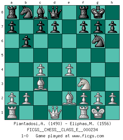 Last move : 1-0 2020 October 8 12:23:38 [Event "FICGS__CHESS__CLASS_E__000234"] [Site "FICGS"] [Date "2020.08.16"] [Round "1"] [White "Piantadosi,Angelo"] [Black "Eliphas,Matthew"] [Result "1-0"] [WhiteElo "1490"] [BlackElo "1556"] 1.d4 Nf6 2.c4 e5 3.dxe5 Ng4 4.e4 Nxe5 5.Nc3 Bb4 6.Bd2 Bxc3 7.Bxc3 Ng6 8.Nf3 O-O 9.Be2 b6 10.O-O 1-0 This chess game has been lost on time (started : 2020.08.16 17:16:50) Budapest : Alekhine variation Kingside Castling by player Black (move 8) Kingside Castling by player White (move 10) Player White won this chess game. Follow this game move after move (download)It is not a move, even the best move that you must seek, but a realizable plan. (Eugene Znosko-Borovsky) Jeder Schachmeister war einmal ein Anfänger. (Irving Chernev) El poder defensivo de una pieza clavada, solamente es imaginario. (Aaron Nimzovich) Aucun coup ne doit être joué sans but. (Pedro Damiano) Mac users swear by their computers. PC users swear at their computers. (Author unknown)