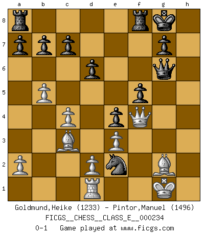 Last move : 0-1 2020 September 6 11:9:44 [Event "FICGS__CHESS__CLASS_E__000234"] [Site "FICGS"] [Date "2020.08.16"] [Round "1"] [White "Goldmund,Heike"] [Black "Pintor,Manuel"] [Result "0-1"] [WhiteElo "1233"] [BlackElo "1496"] 1.b4 e5 2.Bb2 Qf6 3.Nf3 Nc6 4.b5 Nd4 5.e3 Nxf3+ 6.Qxf3 Bc5 7.Be2 d6 8.c4 Qg6 9.Qd5 Nf6 10.Qf3 O-O 11.Nc3 h5 12.O-O h4 13.h3 Bb4 14.Rad1 Bxc3 15.Bxc3 e4 16.Qf4 Bxh3 17.g3 Bxf1 18.Bxf1 hxg3 19.fxg3 Nh5 20.Qf2 Nxg3 21.Bg2 f5 22.Qf4 Ne2+ 0-1 Polish (Sokolsky) opening Kingside Castling by player Black (move 10) Kingside Castling by player White (move 12) Player Black won this chess game. Follow this game move after move (download)You know you're going to lose. Even when I was ahead I knew I was going to lose. - On playing against Fischer. (Andrew Soltis) Ich organisiere ein großes Turnier, was mich etwa 120000 Dollar kostet. Ich denke, das ist das erste Mal in der Schachgeschichte, daß ein Schachgroßmeister auch als Mäzen auftritt. (Miguel Najdorf) El Ajedrez te enseña a controlarl la excitación inicial que sientes cuando vez algo que parece bueno y te enseña a pensar objetivamente cuando te encuentras en problemas. (Stanley Kubrick) Echiquier : carré parfait, comme la Jérusalem nouvelle décrite par l'auteur de l'Apocalypse, huit cases sur huit, exaltation du chiffre 4, symbole du cosmos aux quatre horizons... où le noir et le blanc, l'ombre et la lumière, le mal et le bien s'entremêlent et se conjuguent. (Robert Couffignal, Le Gambit du poète) Question: Is 'This statement is paradoxical' a paradoxical statement ? Or is it a meta-paradox ? (Normajean Yates)