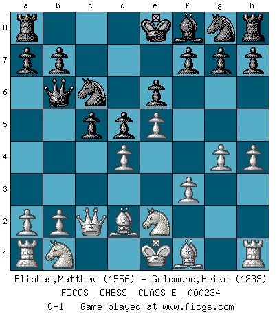 Last move : 0-1 2020 October 4 18:0:18 [Event "FICGS__CHESS__CLASS_E__000234"] [Site "FICGS"] [Date "2020.08.16"] [Round "1"] [White "Eliphas,Matthew"] [Black "Goldmund,Heike"] [Result "0-1"] [WhiteElo "1556"] [BlackElo "1233"] 1.e4 d5 2.e5 Bf5 3.h4 e6 4.d4 c5 5.f3 Nc6 6.g4 Qa5+ 7.Bd2 Bxc2 8.Qxc2 Qc7 9.Ne2 Qb6 0-1 This chess game has been lost on time (started : 2020.08.16 17:16:50) Scandinavian (centre counter) defense Player Black won this chess game. Follow this game move after move (download)Chess is played with the mind and not with the hands ! (Renaud and Kahn) Spielt Blackmar-Diemer-Gambit, und das Matt kommt von selbst! (Emil Joseph Diemer) El jugador blanco perdió porque fallo en recordar la coreccta continuación y tuvo que pensar por sí mismo las movidas. (Siegbert Tarrasch) Le plus grand jeu de l'esprit jamais inventé, plus vous l'apprenez, plus vous y prenez du plaisir. (Garry Kasparov) I couldn't make any sense out of what this particular thread is about. It sounds like R2 D2 computer speaking. A space fight ?!? Some 'command' problems in Moscow ? Some killers & narcotic addicts attacking some game & a god wannabe ?? (Dinesh De Silva, lost in a russian conflict in FICGS forum)