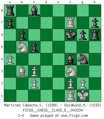 Last move : 1-0 2020 September 24 22:25:15 [Event "FICGS__CHESS__CLASS_E__000234"] [Site "FICGS"] [Date "2020.08.16"] [Round "1"] [White "Martinez Camacho,Victor Hugo"] [Black "Goldmund,Heike"] [Result "1-0"] [WhiteElo "1288"] [BlackElo "1233"] 1.e4 d5 2.exd5 Qxd5 3.d4 e5 4.dxe5 Qxe5+ 5.Qe2 Bd6 6.Qxe5+ Bxe5 7.Nf3 Bd6 8.Bc4 Nf6 9.Ng5 O-O 10.O-O Nbd7 11.Nc3 Ne5 12.Bb3 Re8 13.Be3 Neg4 14.Bxf7+ Kf8 15.Bb3 Bxh2+ 16.Kh1 Bd6 17.Bd4 Bf4 18.Nf3 b6 19.Nb5 c5 20.Bc3 Ba6 21.a4 Ne4 22.Rad1 Nxc3 23.bxc3 Re6 24.Rd7 Rh6+ 25.Kg1 Bc8 26.Rd8+ Ke7 27.Rg8 g6 28.Rg7+ Kf6 29.Rf7+ 1-0 Scandinavian (centre counter) defense Kingside Castling by player Black (move 9) Kingside Castling by player White (move 10) Player White won this chess game. Follow this game move after move (download)My opponents make good moves too. Sometimes I don't take these things into consideration. (Bobby Fischer) In der Schule lernt man nichts. Es ist nur Zeitverschwendung. (Robert James Fischer) En posiciones complicadas, Bobby Fischer pocas veces tuvo que temer de cualquiera. (Paul Keres) Les échecs sont utiles à l'exercice de la faculté de penser et à celle de l'imagination. Car nous devons posséder une méthode élaborée pour atteindre des buts partout où nous devons conduire notre raison. (Leibnitz) There is no vagueness without wind. (Chinese proverb)