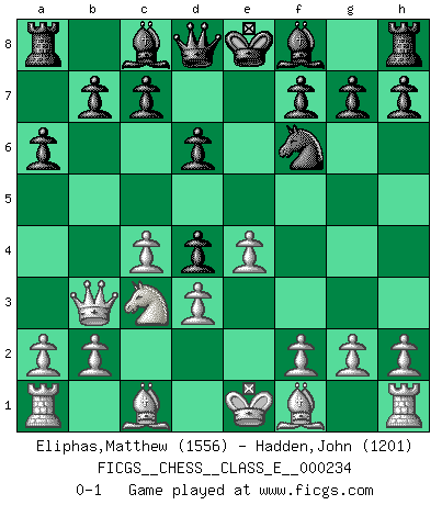 Last move : 0-1 2020 October 8 12:23:38 [Event "FICGS__CHESS__CLASS_E__000234"] [Site "FICGS"] [Date "2020.08.16"] [Round "1"] [White "Eliphas,Matthew"] [Black "Hadden,John"] [Result "0-1"] [WhiteElo "1556"] [BlackElo "1201"] 1.e4 e5 2.c4 d6 3.Nc3 Nf6 4.Nf3 Nc6 5.Qb3 a6 6.d3 Nd4 7.Nxd4 exd4 0-1 This chess game has been lost on time (started : 2020.08.16 17:16:50) King's pawn game Player Black won this chess game. Follow this game move after move (download)He who fears an isolated Queen's Pawn should give up Chess. (Siegbert Tarrasch) Ich habe die Schachforschung dermaßen betrieben, dass sie auf eine wissenschaftliche Basis gestellt wurde. (Mikhail Moiseyevich Botvinik) Cuando me preguntan: -¿Cual es el secreto que te hace hacer mejores movidas que tus oponentes?, Yo respondo: Me da gusto que me pregunten eso, porque, como veran, hay una simple razón. Yo pienso mis propias movidas y dejo a mi oponente que el piense las suyas. (Alexander Alekhine) Des idées, des idées, j'en ai cent, j'en ai mille. Des bonnes, des mauvaises, applicables, irréalisables... Il suffit de faire le tri ! (Roos) Opportunities multiply as they are seized. (Sun Tzu)