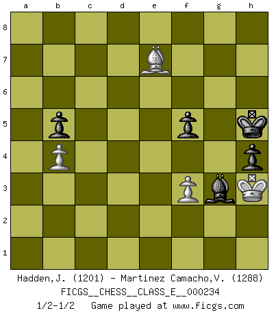 Last move : 1/2-1/2 2020 November 12 23:38:26 [Event "FICGS__CHESS__CLASS_E__000234"] [Site "FICGS"] [Date "2020.08.16"] [Round "1"] [White "Hadden,John"] [Black "Martinez Camacho,Victor Hugo"] [Result "1/2-1/2"] [WhiteElo "1201"] [BlackElo "1288"] 1.d4 Nf6 2.Nc3 e6 3.e3 d5 4.Nf3 c6 5.h3 Be7 6.Bd2 O-O 7.Bd3 Nbd7 8.O-O c5 9.dxc5 Bxc5 10.a3 b6 11.b4 Bd6 12.e4 dxe4 13.Bxe4 Nxe4 14.Nxe4 Be7 15.c4 Bb7 16.Nc3 Nf6 17.Qc2 Rc8 18.Ne5 Qd6 19.Nf3 Bxf3 20.gxf3 Qe5 21.Ne4 Nxe4 22.Qxe4 Qxe4 23.fxe4 Rxc4 24.f3 Rfc8 25.Rac1 Rxc1 26.Bxc1 h6 27.Bf4 Rc3 28.Bc1 a5 29.Kg2 Bh4 30.Rd1 Rc2+ 31.Kg1 Rf2 32.Rf1 Rxf1+ 33.Kxf1 Bf6 34.Be3 axb4 35.axb4 b5 36.Bc5 g5 37.Kg2 Bc3 38.Kg3 Kg7 39.Kg4 Kg6 40.h4 gxh4 41.Kxh4 f5 42.exf5+ exf5 43.Kg3 h5 44.Kh4 Be1+ 45.Kh3 Kg5 46.Bd6 Bd2 47.Kg3 h4+ 48.Kg2 Bf4 49.Be7+ Kh5 50.Kh3 Bg3 51.Kg2 Be1 52.Kh3 Bf2 53.Kg2 Bg3 54.Kh3 1/2-1/2 Follow this game move after move (download)Castle early and often. (Rob Sillars) Vielleicht wirkt die Aura früherer Spieler glanzvoller als die der heutigen Spieler, aber das liegt daran, dass man kein Programm wie Fritz hatte, das einem all die Löcher in ihren Partien zeigt. (Vladimir Kramnik) Jugadores de primera clase pierden en contra de jugadores de segunda clase porque los jugadores de segunda clase a veces juegan una partida de primer clase. (Siegbert Tarrasch) Les Echecs sont et restent toujours un combat, un combat intégral comme la boxe, la lutte ou un autre sport, et où il doit y avoir un vainqueur et un vaincu. (Joseph Emil Diemer) Coffee just isn't my cup of tea. (Unknown)