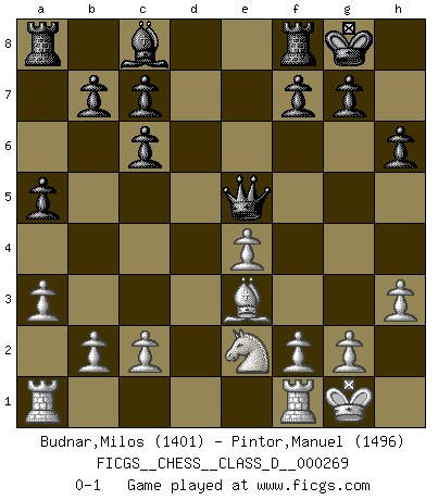 Last move : 0-1 2020 September 13 11:38:12 [Event "FICGS__CHESS__CLASS_D__000269"] [Site "FICGS"] [Date "2020.08.21"] [Round "1"] [White "Budnar,Milos"] [Black "Pintor,Manuel"] [Result "0-1"] [WhiteElo "1401"] [BlackElo "1496"] 1.e4 e5 2.Nf3 Nc6 3.Bb5 Bc5 4.O-O Qf6 5.d3 h6 6.Nc3 Nge7 7.Bxc6 dxc6 8.h3 O-O 9.a3 a5 10.Qe2 Ng6 11.Be3 Bd6 12.d4 Nf4 13.dxe5 Nxe2+ 14.Nxe2 Bxe5 15.Nxe5 Qxe5 0-1 Ruy Lopez : Classical (Cordel) defense Kingside Castling by player White (move 4) Kingside Castling by player Black (move 8) Player Black won this chess game. Follow this game move after move (download)In Chess, at least, the brave inherit the earth. (Edmar Mednis) Je älter ich werde, um so mehr schätze ich die Bauern. (Paul Keres) Un buen jugador siempre tiene buena suerte. (José Raúl Capablanca) Les sacrifices démontrent seulement que quelqu'un a gaffé. (Savielly Tartacover) Those who make the worst use of their time are the first to complain of its brevity. (Jean de la Bruyere)