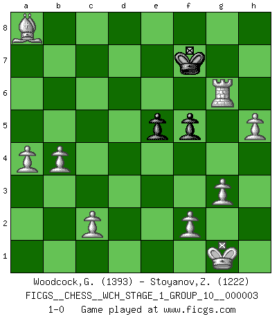 Last move : 1-0 2007 October 4 10:3:14 [Event "FICGS__CHESS__WCH_STAGE_1_GROUP_10__000003"] [Site "FICGS"] [Date "2007.07.11"] [Round "1"] [White "Woodcock,Graham"] [Black "Stoyanov,Zdravko"] [Result "1-0"] [WhiteElo "1393"] [BlackElo "1222"] 1.d4 d5 2.g3 h6 3.Bh3 e6 4.Nf3 Nc6 5.Bf4 Nf6 6.Ne5 Nxe5 7.Bxe5 Be7 8.Nc3 Bb4 9.Qd2 O-O 10.a3 Bd6 11.Nb5 Bxe5 12.dxe5 Ne4 13.Qe3 b6 14.Bg2 Nc5 15.O-O Ba6 16.Nd4 Na4 17.b3 Nc5 18.Nc6 Qe8 19.Nb4 Bb5 20.a4 Bd7 21.Na6 Qc8 22.Nxc5 bxc5 23.Qxc5 c6 24.e4 dxe4 25.Bxe4 a5 26.Rad1 Rd8 27.Rd6 Qa6 28.Bxc6 Qc8 29.Rfd1 Qc7 30.Rxd7 Rxd7 31.Rxd7 Qc8 32.Qe7 Qf8 33.Bxa8 Qxe7 34.Rxe7 Kf8 35.Ra7 f6 36.exf6 gxf6 37.Rxa5 Ke7 38.Rh5 Kd6 39.Rxh6 f5 40.Rg6 Ke7 41.h4 Kf7 42.h5 e5 43.b4 1-0 Queen's pawn game Kingside Castling by player Black (move 9) Kingside Castling by player White (move 15) Player White won this chess game. Follow this game move after move (download)By playing at Chess then, we may learn: First: Foresight... Second: Circumspection... Third: Caution... And lastly, we learn by Chess the habit of not being discouraged by present bad appearances in the state of our affairs, the habit of hoping for a favorable chance, and that of persevering in the secrets of resources. (Benjamin Franklin) Ein Großmeister muß tausende Partien in seinem Kopf speichern, denn diese sind für Ihn, was die Worte der Muttersprache für gewöhnliche Leute sind, oder Noten für Musiker... (Garry Kasparov) El Ajedrez es un expediente tonto que hace creer a la gente inactiva que hacen una cosa muy astuta cuando solamente estan perdiendo su tiempo. (George Bernard Shaw) Shah mat. Le roi est mort. Cri de fierté d'un joueur venant de terrasser son adversaire, courtoisement, sans effusion de sang. Looking at the proliferation of personal web pages on the Net, it looks like very soon everyone on Earth will have 15 megabytes of fame. (M.G. Sriram)