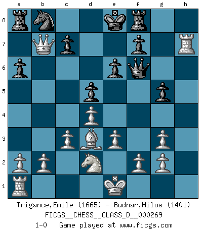 Last move : 1-0 2020 September 14 16:28:26 [Event "FICGS__CHESS__CLASS_D__000269"] [Site "FICGS"] [Date "2020.08.21"] [Round "1"] [White "Trigance,Emile"] [Black "Budnar,Milos"] [Result "1-0"] [WhiteElo "1665"] [BlackElo "1401"] 1.d4 Nf6 2.Nf3 d5 3.Bf4 Bg4 4.e3 e6 5.Nbd2 Bd6 6.Bg5 h6 7.Bh4 g5 8.Bg3 Bxg3 9.hxg3 a6 10.c3 O-O 11.Rxh6 Nh5 12.Bd3 Kg7 13.Rh7+ Kf6 14.Qb3 Ke7 15.Ne5 Ke8 16.Nxg4 Nf6 17.Nxf6+ Qxf6 18.Qxb7 1-0 Queen's pawn game Kingside Castling by player Black (move 10) Player White won this chess game. Follow this game move after move (download)As one by one I mowed them down, my superiority soon became apparent. (Jose Capablanca) Jeder Fehler erscheint unglaublich dumm, wenn andre ihn begehen. (Georg Christoph Lichtenberg) Al jugar al Ajedrez entonces, podemos aprender: Primero: Previsión... Segundo: Prudencia... Tercero: Cautela... Y al final, aprendemos del Ajedrez el hábito de no ser desanimados por apariencias malas presentes en el estado de nuestros asuntos, el hábito de la esperanza por una oportunidad favorable y la perseveración de los secretos de los recursos. (Benjamin Franklin) On n'a jamais que l'âge auquel on a commence à jouer aux échecs car après on cesse de vieillir. (Capablanca) The Internet is the first thing that humanity has build that humanity doesn't understand, the largest experiment in anarchy that we have ever had. (Eric Schmidt)
