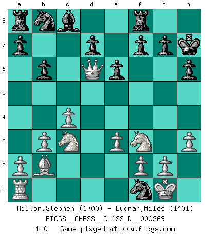 Last move : 1-0 2020 September 18 15:54:2 [Event "FICGS__CHESS__CLASS_D__000269"] [Site "FICGS"] [Date "2020.08.21"] [Round "1"] [White "Hilton,Stephen"] [Black "Budnar,Milos"] [Result "1-0"] [WhiteElo "1700"] [BlackElo "1401"] 1.d4 Nf6 2.Nf3 e6 3.e3 Bd6 4.Bd3 O-O 5.O-O h6 6.b3 c5 7.Bb2 Qc7 8.c4 b6 9.Nc3 Ng4 10.h3 Nh2 11.dxc5 Nxf1 12.cxd6 Qxd6 13.Bh7+ Kxh7 14.Qxd6 1-0 Queen's pawn : Yusupov-Rubinstein system Kingside Castling by player Black (move 4) Kingside Castling by player White (move 5) Player White won this chess game. Follow this game move after move (download)Could we look into the head of a Chess player, we should see there a whole world of feelings, images, ideas, emotion and passion. (Alfred Binet) Der Knackpunkt bei der Konzentration ist, daß wir nur durch sie etwas Neues und Ungewöhnliches am Schachbrett finden können. Sie ist der einzige Weg durch neue neue Ideen eine Überraschung zu bereiten. (Garry Kasparov) Si tu oponente te ofrece un empate, trata de averiguar porque piensa él que esta en una posición peor. (Nigel Short) Un millionnaire : 'Monsieur Steinitz ! Vous ne participez aux tournois que pour l'argent, alors que moi je n'y viens que pour l'honneur.' Steinitz : 'Chacun joue pour ce qu'il n'a pas'... Luck is what you have left over after you give 100 percent. (Langston Coleman)