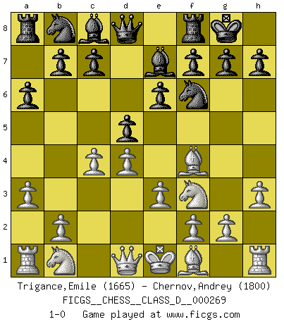 Last move : 1-0 2020 October 10 16:38:23 [Event "FICGS__CHESS__CLASS_D__000269"] [Site "FICGS"] [Date "2020.08.21"] [Round "1"] [White "Trigance,Emile"] [Black "Chernov,Andrey"] [Result "1-0"] [WhiteElo "1665"] [BlackElo "1800"] 1.d4 d5 2.Nf3 Nf6 3.Bf4 e6 4.e3 a6 5.a3 Be7 6.h3 O-O 7.c4 1-0 This chess game has been lost on time (started : 2020.08.21 22:34:32) Queen's Bishop game Kingside Castling by player Black (move 6) Player White won this chess game. Follow this game move after move (download)Openings teach you openings. Endgames teach you chess ! (Stephan Gerzadowicz) Karpov ist ein Museumsstück. (Garry Kasparov) Desconfianza es la característica mas necesaria de un jugador de Ajedrez. (Siegbert Tarrasch) Les ravages du H expliquent la différence de niveau entre Tal et Thal [Abergel]. Good decisions come from experience, and experience comes from bad decisions. (Anonymous)
