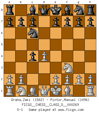 Last move : 0-1 2020 October 2 12:53:17 [Event "FICGS__CHESS__CLASS_D__000269"] [Site "FICGS"] [Date "2020.08.21"] [Round "1"] [White "Oraha,Zaki"] [Black "Pintor,Manuel"] [Result "0-1"] [WhiteElo "1562"] [BlackElo "1496"] 1.Nf3 Nc6 2.d4 d5 3.c4 dxc4 0-1 This chess game has been lost on time (started : 2020.08.21 22:34:32) Reti Opening Player Black won this chess game. Follow this game move after move (download)I played Chess with him and would have beaten him sometimes only he always took back his last move, and ran the game out differently. (Mark Twain) Wie gewinnt Tal? Er entwickelt alle seine Figuren in die Brettmitte und opfert sie dann irgendwo. (Robert James Fischer) Tu sabes que vas a perder. Aún cuando tenía la ventaja, yo sabía que iba a perder. - al estar jugando con Fischer (Andrew Soltis) Ne tendez aucun piège pour le plaisir ! Ne jouez rien dans l'espoir que l'adversaire réagisse de façon stupide ! Prenez toujours pour acquis que l'adversaire va trouver le meilleur coup ! Ne jouez jamais de coup dans l'espoir que l'adversaire ne voie pas la menace ! Chacun de vos coups doit améliorer la position d'une façon ou d'une autre. Even the best needles are not sharp at both ends. (Chinese proverb)