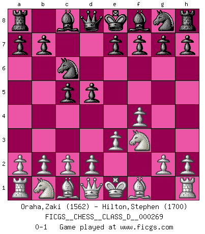 Last move : 0-1 2020 October 4 5:54:42 [Event "FICGS__CHESS__CLASS_D__000269"] [Site "FICGS"] [Date "2020.08.21"] [Round "1"] [White "Oraha,Zaki"] [Black "Hilton,Stephen"] [Result "0-1"] [WhiteElo "1562"] [BlackElo "1700"] 1.f4 c5 2.Nf3 Nc6 3.e3 d5 0-1 This chess game has been lost on time (started : 2020.08.21 22:34:32) Bird's Opening Player Black won this chess game. Follow this game move after move (download)Examine moves that smite! A good eye for smites is far more important than a knowledge of strategical principles. (Purdy) Karpov ist ein Museumsstück. (Garry Kasparov) La estratégia requiere pensar, la táctica requiere observación. (Max Euwe) Les échecs, c'est l'art d'analyser. (Mikhail Botvinnik) The existence of forgetting has never been proved: We only know that some things don't come to mind when we want them. (Friedrich Nietzsche)