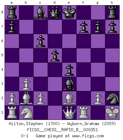 Last move : 0-1 2020 September 18 13:42:4 [Event "FICGS__CHESS__RAPID_B__000351"] [Site "FICGS"] [Date "2020.08.21"] [Round "1"] [White "Hilton,Stephen"] [Black "Wyborn,Graham"] [Result "0-1"] [WhiteElo "1700"] [BlackElo "2059"] 1.d4 d5 2.Nf3 Nf6 3.e3 e6 4.Bd3 c5 5.b3 Nc6 6.O-O cxd4 7.Bb2 dxe3 8.fxe3 Bc5 9.Nd4 e5 10.Nxc6 bxc6 11.Qd2 Ng4 12.Kh1 Bxe3 13.Qe1 e4 14.Be2 Nxh2 0-1 Queen's pawn game, Rubinstein (Colle-Zukertort) variation Kingside Castling by player White (move 6) Player Black won this chess game. Follow this game move after move (download)In life, as in Chess, one's own Pawns block one's way. A man's very wealth, ease, leisure, children, books, which should help him to win, more often checkmate him. (Charles Buxton) Unter Putin wird alles Geld aus Russland wie von einem Staubsauger nach Moskau umgeleitet, das ist wie ein schwarzes Loch. (Garry Kasparov) El Peón aislado arroja penumbra sobre todo el tablero. (Aaron Nimzovich) Le jeu d'échecs fait naître et fortifie en nous plusieurs qualités précieuses dans le cours de l'existence, telles que la prévoyance, la circonspection, la prudence, et la persévérance. (Benjamin Franklin - 1783, la morale des échecs) A bird doesn't sing because it has an answer, it sings because it has a song. (Maya Angelou)