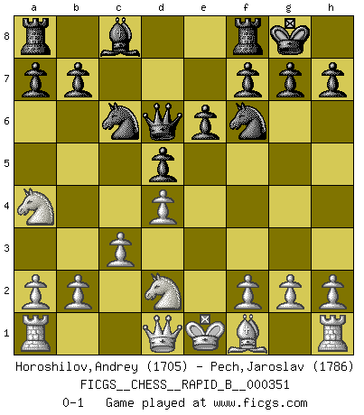 Last move : 0-1 2020 November 7 5:55:3 [Event "FICGS__CHESS__RAPID_B__000351"] [Site "FICGS"] [Date "2020.08.21"] [Round "1"] [White "Horoshilov,Andrey"] [Black "Pech,Jaroslav"] [Result "0-1"] [WhiteElo "1705"] [BlackElo "1786"] 1.Nc3 d5 2.d4 Nf6 3.Bf4 e6 4.Nf3 Bb4 5.Nd2 O-O 6.e3 c5 7.Na4 cxd4 8.exd4 Nc6 9.c3 Bd6 10.Bxd6 Qxd6 0-1 This chess game has been lost on time (started : 2020.08.21 22:36:43) Follow this game move after move (download)When you see a good move, look for a better one. (Emanuel Lasker) Du musst Deinen Gegner in einen tiefen dunklen Wald führen wo 2+2=5 ist und wo der Weg, der wieder hinausführt, nur breit genug für einen ist. (Mikhail Nekhemyevich Tal) El Ajedrez es como la guerra en un tablero. (Bobby Fischer) La vie et les Echecs sont tous les deux une lutte constante. (Lasker) I think your argument is specious - I think your tie is ugly. (Gregory House to Dr. Foreman, House M.D.)