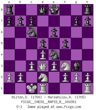 Last move : 0-1 2020 September 4 17:17:55 [Event "FICGS__CHESS__RAPID_B__000351"] [Site "FICGS"] [Date "2020.08.21"] [Round "1"] [White "Hilton,Stephen"] [Black "Horoshilov,Andrey"] [Result "0-1"] [WhiteElo "1700"] [BlackElo "1705"] 1.d4 d5 2.Nf3 Bf5 3.Bf4 e6 4.e3 Bd6 5.Bg3 Nc6 6.c3 Nf6 7.Bd3 Bxd3 8.Qxd3 Ne4 9.Nbd2 f5 10.O-O-O Bxg3 0-1 Queen's pawn game Queenside Castling by player White (move 10) Player Black won this chess game. Follow this game move after move (download)The King is a fighting piece. Use it ! (Wilhelm Steinitz) Kombinieren und Schwarzhandel gehören verboten. (Savielly Grigorievitsch Tartakower) El Ajedrez moderno está demasiado preocupado con cosas como la estructura de Peones. Olvidenlo, el Jaque Mate termina la partida. (Nigel Short) Donnez-moi un Cavalier en 6e et je gagnerais toutes mes parties. (Steinitz) Any activity becomes creative when the doer cares about doing it right or doing it better. (John Updike)