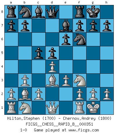 Last move : 1-0 2020 October 6 11:11:1 [Event "FICGS__CHESS__RAPID_B__000351"] [Site "FICGS"] [Date "2020.08.21"] [Round "1"] [White "Hilton,Stephen"] [Black "Chernov,Andrey"] [Result "1-0"] [WhiteElo "1700"] [BlackElo "1800"] 1.d4 d5 2.Nf3 e6 3.e3 Nf6 4.Bd3 Be7 5.O-O O-O 6.b3 c5 7.Bb2 1-0 This chess game has been lost on time (started : 2020.08.21 22:36:43) Queen's pawn game Kingside Castling by player White (move 5) Kingside Castling by player Black (move 5) Player White won this chess game. Follow this game move after move (download)After black's reply to 1.e4 with 1..e5, leaves him always trying to get into the game. (Howard Staunton) Habe Mut, dich deines eigenen Verstandes zu bedienen. (Immanuel Kant) Coloca el contenido de las piezas del Ajedrez en un sombrero, agitalo vigorosamente, arrojalas en un tablero desde una altura de 30 centimetros y así obtendras el estilo de Steinitz. (H. E. Bird) On entre au jeu d'Echecs comme on entre en Religion. Pour le joueur d'Echecs, la partie d'Echecs c'est l'office, la messe, le défilé du 1er Mai, le dépôt de gerbe au Monument aux Morts. C'est un drame sacré. (Michel Roos) If we knew what we were doing, we would not call it research. (Albert Einstein)