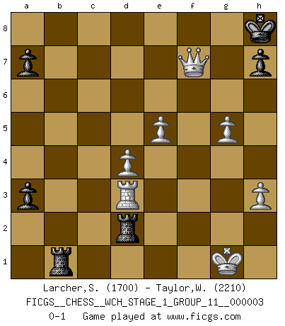 Last move : 0-1 2007 December 5 14:33:0 [Event "FICGS__CHESS__WCH_STAGE_1_GROUP_11__000003"] [Site "FICGS"] [Date "2007.07.11"] [Round "1"] [White "Larcher,Sebastien"] [Black "Taylor,William"] [Result "0-1"] [WhiteElo "1700"] [BlackElo "2210"] 1.d4 Nf6 2.e3 g6 3.g3 Bg7 4.Bg2 O-O 5.Nf3 d5 6.O-O Nc6 7.Nc3 Qd6 8.Nb5 Qd7 9.Nc3 Rd8 10.Ne5 Nxe5 11.dxe5 Ng4 12.f4 c6 13.h3 Nh6 14.e4 d4 15.Ne2 Qc7 16.Qd3 c5 17.c3 c4 18.Qf3 d3 19.Nd4 Bd7 20.g4 Kh8 21.g5 Ng8 22.Be3 e6 23.Rfd1 Ne7 24.b3 b5 25.Qf2 Rab8 26.a4 bxa4 27.bxc4 Qxc4 28.Rac1 a3 29.Bf1 Bf8 30.Rd2 Qc8 31.Bxd3 Nc6 32.Nxc6 Bxc6 33.Bd4 Bb5 34.Bxb5 Rxb5 35.Kh2 Bc5 36.Rcd1 Bxd4 37.cxd4 Rb3 38.Qf1 Qc3 39.Rd3 Qc2+ 40.R1d2 Qc4 41.f5 exf5 42.exf5 Rb2 43.fxg6 Rxd2+ 44.Kg1 Rb8 45.gxf7 Qxf7 46.Qxf7 Rb1+ 0-1 Queen's pawn game Kingside Castling by player Black (move 4) Kingside Castling by player White (move 6) Player Black won this chess game. Follow this game move after move (download)Chess is no whit inferior to the violin, and we have a large number of professional violinists. (Mikhail Botvinnik) Wenn sie aufgeben, dann danke ich Ihnen für das Spiel (Eventualzug beim Fernschach). (Anonymous) La enorme capacidad mental, en la que sin ella no puede un jugador de Ajedrez existir, es demasiado requerida por el Ajedrez al grado de que nunca podrá liberar su mente de este juego. (Albert Einstein) Votre seul travail dans les ouvertures est d'obtenir un milieu de partie jouable. (Lajos Portish) The mind is like a parachute, it only functions when its open. (Unknown)