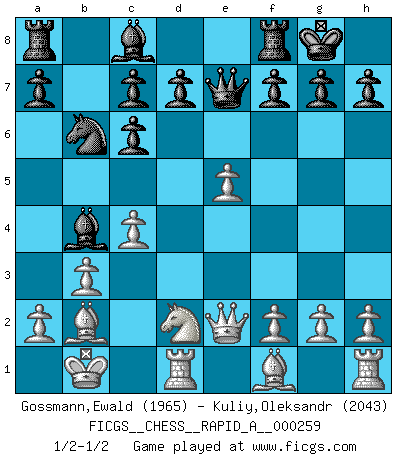 Last move : 1/2-1/2 2020 August 30 19:14:36 [Event "FICGS__CHESS__RAPID_A__000259"] [Site "FICGS"] [Date "2020.08.22"] [Round "1"] [White "Gossmann,Ewald"] [Black "Kuliy,Oleksandr"] [Result "1/2-1/2"] [WhiteElo "1965"] [BlackElo "2043"] 1.e4 e5 2.Nf3 Nc6 3.d4 exd4 4.Nxd4 Nf6 5.Nxc6 bxc6 6.e5 Qe7 7.Qe2 Nd5 8.c4 Nb6 9.b3 Qe6 10.Bb2 Bb4+ 11.Nd2 O-O 12.O-O-O Qe7 13.Kb1 Ba3 14.Bc3 Bb4 15.Bb2 Ba3 16.Bc3 Bb4 17.Bb2 1/2-1/2 Scotch : Mieses variation Kingside Castling by player Black (move 11) Queenside Castling by player White (move 12) This chess game ended in a draw. Follow this game move after move (download)When you don't know what to do, wait for your opponent to get an idea - it's sure to be wrong. (Tarrasch) Es ist peinlich, dass ich nie Weltmeister wurde. Es wäre leicht, Leonid Breschnjew als Ursache vorzuschieben, dessen Apparat den Vorzeigekommunisten Anatoli Karpow in allem unterstützte. Aber Garri Kasparow zum Beispiel, der ebenfalls von den Sowjets unerwünscht war, hat trotz der Widerstände den WM-Titel erobert. (Viktor Kortschnoi) Si no le temes a Spassky, entonces elimino el elemento del dinero. (Jim Slater) La victoire dans une partie d'Echecs appartient la plupart du temps à celui qui voit un peu plus loin que l'adversaire. (Lasker) A good book on your shelf is a friend that turns its back on you and remains a friend. (Author unknown)