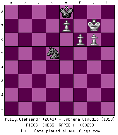 Last move : 1-0 2020 September 13 20:22:27 [Event "FICGS__CHESS__RAPID_A__000259"] [Site "FICGS"] [Date "2020.08.22"] [Round "1"] [White "Kuliy,Oleksandr"] [Black "Cabrera,Claudio"] [Result "1-0"] [WhiteElo "2043"] [BlackElo "1929"] 1.e4 e5 2.Nf3 Nc6 3.Bb5 a6 4.Ba4 Nf6 5.O-O Nxe4 6.d4 b5 7.Bb3 d5 8.dxe5 Be6 9.Nbd2 Be7 10.c3 Nc5 11.Bc2 d4 12.cxd4 Nxd4 13.Nxd4 Qxd4 14.Nf3 Qxd1 15.Rxd1 O-O 16.Ng5 Rfd8 17.Bxh7+ Kf8 18.Nxe6+ Nxe6 19.Rf1 Bc5 20.Be4 Rab8 21.Be3 Bd4 22.Bxd4 Rxd4 23.Bf3 c5 24.Rfd1 Rbd8 25.Kf1 Rd2 26.b3 Ke7 27.g3 R8d4 28.h4 Rb2 29.Kg2 Rxd1 30.Bxd1 g6 31.Bf3 a5 32.g4 Kf8 33.Kg3 Kg7 34.h5 Nd4 35.hxg6 fxg6 36.Rc1 Rxa2 37.Rxc5 a4 38.Be4 axb3 39.Rd5 Nc2 40.Rxb5 Nd4 41.Rb7+ Kf8 42.Bxg6 Ra6 43.Be4 Ra5 44.f4 Rb5 45.Rxb5 Nxb5 46.f5 Nc3 47.Bd3 b2 48.g5 b1Q 49.Bxb1 Nxb1 50.Kf4 Nc3 51.e6 Nd5+ 52.Ke5 Ne7 53.f6 Ng6+ 54.Kf5 Nh4+ 55.Kg4 Ng6 56.e7+ Kf7 57.Kh5 Nf4+ 58.Kh6 Nd5 59.g6+ Ke8 60.Kg7 1-0 Ruy Lopez : Open, 7.Bb3 Kingside Castling by player White (move 5) Kingside Castling by player Black (move 15) 10 pieces endgame at move 42 : White KRBPPP , Black KRNP WHITE : King + 1 Rook 1 Bishop 3 Pawns BLACK : King + 1 Rook 1 Knight 1 Pawn 9 pieces endgame at move 45 : White KRBPPP , Black KNP WHITE : King + 1 Rook 1 Bishop 3 Pawns BLACK : King + 1 Knight 1 Pawn 8 pieces endgame at move 45 : White KBPPP , Black KNP WHITE : King + 1 Bishop 3 Pawns BLACK : King + 1 Knight 1 Pawn Promotion Queen by player Black (move 48) 7 pieces endgame at move 49 : White KBPPP , Black KN WHITE : King + 1 Bishop 3 Pawns BLACK : King + 1 Knight 6 pieces endgame at move 49 : White KPPP , Black KN WHITE : King + 3 Pawns BLACK : King + 1 Knight Player White won this chess game. Follow this game move after move (download)If you aren't afraid of Spassky, then I have removed the element of money. (Jim Slater) Wie gewinnt Tal? Er entwickelt alle seine Figuren in die Brettmitte und opfert sie dann irgendwo. (Robert James Fischer) Un sacrificio se refuta mucho mejor al aceptarlo. (Wilhelm Steinitz) La vie est comme un jeu d'échecs : nous esquissons un plan, mais celui-ci est tributaire de ce que daignent faire l'adversaire aux échecs et le destin dans la vie. (Arthur Schopenhauer) First of all, we have to go back to the classical time control. (Anatoly Karpov)