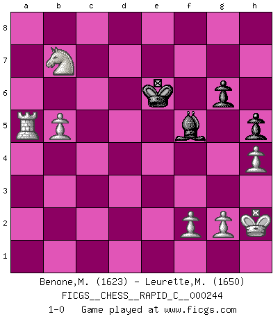Last move : 1-0 2020 September 2 16:2:46 [Event "FICGS__CHESS__RAPID_C__000244"] [Site "FICGS"] [Date "2020.08.27"] [Round "1"] [White "Benone,Mateia"] [Black "Leurette,Marc-Antoine"] [Result "1-0"] [WhiteElo "1623"] [BlackElo "1650"] 1.e4 e5 2.Nf3 Nc6 3.Bb5 a6 4.Ba4 Nf6 5.O-O Bc5 6.c3 d6 7.d4 exd4 8.cxd4 b5 9.dxc5 bxa4 10.cxd6 cxd6 11.Bf4 O-O 12.Qxa4 Bb7 13.Nc3 Re8 14.Rad1 Qa5 15.Bxd6 Nxe4 16.Qxa5 Nxa5 17.Nxe4 Bxe4 18.Nd2 Bd3 19.Rfe1 Rxe1+ 20.Rxe1 Nb7 21.Ba3 f6 22.Re7 Rc8 23.h4 Nc5 24.b3 a5 25.Nf3 Ne4 26.Nd4 g6 27.Ne6 Nc3 28.Rg7+ Kh8 29.Ra7 Ne2+ 30.Kh2 Bf5 31.Ng7 Bb1 32.Bb2 Nc3 33.Ne6 Bxa2 34.Bxc3 Kg8 35.Bxf6 h5 36.Rg7+ Kh8 37.Rc7 Kg8 38.Rxc8+ Kf7 39.Nc5 Kxf6 40.Ra8 Bb1 41.Rxa5 Ke5 42.Nb7 Ke6 43.Ra6+ Ke5 44.b4 Bf5 45.Ra5+ Ke6 46.b5 1-0 Ruy Lopez : Moeller defense Kingside Castling by player White (move 5) Kingside Castling by player Black (move 11) Player White won this chess game. Follow this game move after move (download)We like to think. (Gary Kasparov) Auf Remis zu spielen ist gewissermaßen ein Verbrechen gegen das Schachspiel. (Mikhail Nekhemyevich Tal) Muchos se han convertido en Maestros de Ajedrez, nadie se ha convertido en el Maestro del Ajedrez. (Siegbert Tarrasch) Si le désir cupide (et stupide) de gagner est une inépuisable source de souffrance, une combinaison brillante sur l'échiquier est une découverte : le coquelicot qui s'épanouit lorsque apparaît la Voie Lactée. (Arrabal) When a man with money meets a man with experience, the man with experience leaves with money and the man with money leaves with experience. (Anonymous)