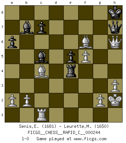 Last move : 1-0 2020 October 1 22:7:44 [Event "FICGS__CHESS__RAPID_C__000244"] [Site "FICGS"] [Date "2020.08.27"] [Round "1"] [White "Senis,Enrico"] [Black "Leurette,Marc-Antoine"] [Result "1-0"] [WhiteElo "1681"] [BlackElo "1650"] 1.e4 e5 2.Nf3 Nc6 3.Bb5 a6 4.Ba4 Nf6 5.d3 b5 6.Bb3 Be7 7.c3 O-O 8.Nbd2 d5 9.O-O dxe4 10.dxe4 Bd6 11.Re1 Re8 12.Nf1 Bb7 13.Ng3 h6 14.Nf5 Ne7 15.Nxh6+ gxh6 16.Bxh6 Ng4 17.Bg5 Kg7 18.h3 f6 19.Bh4 Nh6 20.Bg3 Ng6 21.Nh4 Nxh4 22.Bxh4 Kh7 23.Qe2 Be7 24.Rad1 Bd6 25.c4 bxc4 26.Bxc4 Rf8 27.f4 Qe7 28.f5 Bc5+ 29.Kh2 Rad8 30.Rxd8 Rxd8 31.Rc1 Rd4 32.Qh5 Rxe4 33.Qg6+ Kh8 34.Qxh6+ Qh7 35.Bxf6+ 1-0 Ruy Lopez : Anderssen variation Kingside Castling by player Black (move 7) Kingside Castling by player White (move 9) Player White won this chess game. Follow this game move after move (download)The game of chess is the touchstone of the intellect. (Goethe) Ich erzeugte keinen Neid, da mich die Schachspieler als Musiker und die Musiker als Schachspieler betrachteten. (Mark Taimanov) Nunca antes ha habido un jugador de Ajedrez con tal conocimiento a fondo de las complejidades del juego y una inmensa voluntad absolutamente indomable de ganar. Yo pienso que Fischer es el jugador mas grande que jamás haya existido. (Lisa Lane) Avec des compensations pour le matériel en plus... (Anonyme) Man is reluctant to give credit for intelligence to anyone, except his enemies. (Albert Einstein)