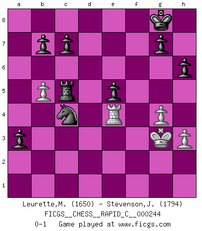 Last move : 0-1 2020 October 19 17:34:17 [Event "FICGS__CHESS__RAPID_C__000244"] [Site "FICGS"] [Date "2020.08.27"] [Round "1"] [White "Leurette,Marc-Antoine"] [Black "Stevenson,John"] [Result "0-1"] [WhiteElo "1650"] [BlackElo "1794"] 1.e4 e5 2.Nf3 Nc6 3.Bc4 Bc5 4.c3 Nf6 5.d3 d6 6.b4 Bb6 7.O-O O-O 8.Re1 h6 9.a4 a5 10.b5 Ne7 11.d4 Ng6 12.Nbd2 Bg4 13.h3 Be6 14.Bxe6 fxe6 15.dxe5 Nxe5 16.Nxe5 dxe5 17.Nf3 Qxd1 18.Rxd1 Nxe4 19.Bb2 Nxf2 20.Rf1 Nd3 21.Kh1 Nxb2 22.Nxe5 Rxf1+ 23.Rxf1 Nxa4 24.c4 Rf8 25.Rc1 Rf5 26.Re1 Bf2 27.Rf1 Rxe5 28.Rxf2 Rc5 29.Rf4 Nb6 30.Re4 e5 31.g4 Nxc4 32.Kg2 a4 33.Kg3 a3 0-1 Giuoco Piano Kingside Castling by player White (move 7) Kingside Castling by player Black (move 7) Player Black won this chess game. Follow this game move after move (download)Chess is the art which expresses the science of logic. (Mikhail Botvinnik) Lisa Lane, amerikanische Schachmeisterin, hatte Fischer einmal als stärksten lebenden Spieler bezeichnet. Antwort: Das ist richtig, aber Lisa Lane ist eigentlich nicht in der Lage, das zu beurteilen. (Robert James Fischer) Muchos jugadores de Ajedrez se sorprendían cuando después de la partida, Fischer explicaba con calma: 'Yo ya había analizado esta posibilidad' en una posición en la cual yo creía que no era posible de prever desde la apertura. (Mikhail Tal) Aidez vos pièces, elles vous aideront. (Paul Morphy) You must have a dream in order to have it come true. (A.P.J. Kalam)