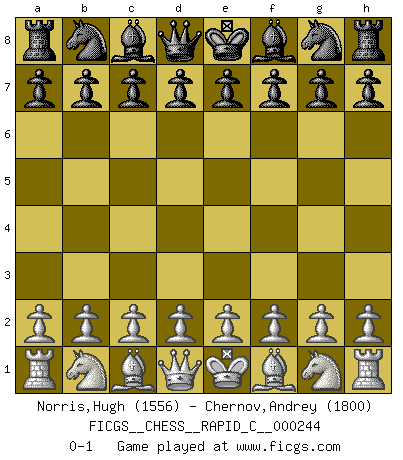 Last move : 0-1 2020 September 26 10:49:52 [Event "FICGS__CHESS__RAPID_C__000244"] [Site "FICGS"] [Date "2020.08.27"] [Round "1"] [White "Norris,Hugh"] [Black "Chernov,Andrey"] [Result "0-1"] [WhiteElo "1556"] [BlackElo "1800"] 0-1 This chess game has been lost on time (started : 2020.08.27 3:59:58) Player Black won this chess game. Follow this game move after move (download)Not only will I predict his triumph over Botvinnik, but I'll go further and say that he'll probably be the greatest Chess player that ever lived. (John Collins) Habe Mut, dich deines eigenen Verstandes zu bedienen. (Immanuel Kant) Yo nunca en mi vida he jugado la Defensa Francesa, que viene siendo la más aburrida de todas las Aperturas. (Wilhelm Steinitz) Que feriez-vous si vous étiez en train de jouer aux échecs et que la fin du monde arrive ? Je continuerais à jouer. (Saint Borromée) May I never be complete. May I never be content. May I never be perfect. Deliver me, Tyler, from being perfect and complete. (Chuck Palahniuk, Fight Club)