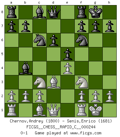 Last move : 0-1 2020 October 6 23:28:57 [Event "FICGS__CHESS__RAPID_C__000244"] [Site "FICGS"] [Date "2020.08.27"] [Round "1"] [White "Chernov,Andrey"] [Black "Senis,Enrico"] [Result "0-1"] [WhiteElo "1800"] [BlackElo "1681"] 1.e4 c5 2.Nf3 Nc6 3.d4 cxd4 4.Nxd4 e5 5.Nf3 Nf6 6.Nc3 Bb4 7.Bd3 d6 8.O-O O-O 0-1 This chess game has been lost on time (started : 2020.08.27 3:59:58) Sicilian : Labourdonnais-Loewenthal variation Kingside Castling by player White (move 8) Kingside Castling by player Black (move 8) Player Black won this chess game. Follow this game move after move (download)In complicated positions, Bobby Fischer hardly had to be afraid of anybody. (Paul Keres) Ich trinke, ich rauche, ich spiele, ich liebe Frauen aber Fernschach ist ein Laster, das ich nicht habe. (Mikhail Nekhemyevich Tal) Para mi, el Ajedrez es la vida y cada partida es como una nueva vida. Todo jugador de Ajedrez suele vivir muchas vidas durante su vida. (Eduard Gufeld) Les écrivains ont utilisé les échecs pour analyser les côtés extrêmes de la nature humaine. Dans ce cadre, les échecs offrent un champ d'expérimentation idéal. Mais on pourrait faire la même chose avec la peinture. Et là, en vous référant à Van Gogh, vous ne tirerez pas de conclusion définitive sur les peintres. (Gary Kasparov) The difference between stupidity and genius is that genius has its limits. (Murphy)