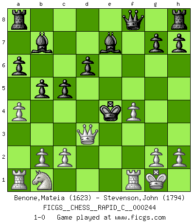 Last move : 1-0 2020 September 5 22:48:18 [Event "FICGS__CHESS__RAPID_C__000244"] [Site "FICGS"] [Date "2020.08.27"] [Round "1"] [White "Benone,Mateia"] [Black "Stevenson,John"] [Result "1-0"] [WhiteElo "1623"] [BlackElo "1794"] 1.e4 e5 2.Nf3 Nc6 3.Bb5 a6 4.Ba4 Nf6 5.O-O b5 6.Bb3 Be7 7.a4 Bb7 8.d4 Nxd4 9.Bxf7+ Kxf7 10.Nxe5+ Ke6 11.Qxd4 c5 12.Qc3 Nxe4 13.Qe3 d6 14.Qb3+ Kxe5 15.Qf7 Qf8 16.f4+ Kd4 17.Be3+ Kxe3 18.Qb3+ Nc3 19.Qxc3+ Ke4 20.Qd3+ 1-0 Ruy Lopez : Wing attack Kingside Castling by player White (move 5) Player White won this chess game. Follow this game move after move (download)Chess is no whit inferior to the violin, and we have a large number of professional violinists. (Mikhail Botvinnik) Mit sehr nachdenklichem Gesicht schreitet Bobby durch den Turniersaal. Was ist passiert?, fragt Lombardy. Ich stehe schlecht, antwortet Fischer. Lombardy: Dann biete doch einfach Remis an. Fischer: So schlecht stehe ich nun auch wieder nicht! (Robert James Fischer) Me dio la sensación de como si yo estuviera jugando en contra del mismo Ajedrez. - al estar jugando en contra de Robert Fischer (Walter Shipman) Les Echecs ont trois composantes : le temps, l'espace et le matériel en dernier. (Mikhail Tal) Luck never made a man wise. (Seneca, Letters to Lucilius)