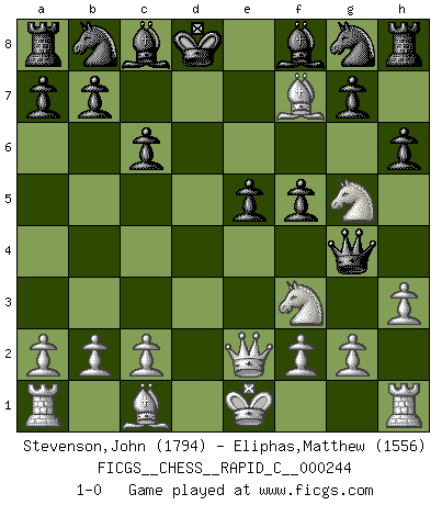 Last move : 1-0 2020 October 9 14:19:54 [Event "FICGS__CHESS__RAPID_C__000244"] [Site "FICGS"] [Date "2020.08.27"] [Round "1"] [White "Stevenson,John"] [Black "Eliphas,Matthew"] [Result "1-0"] [WhiteElo "1794"] [BlackElo "1556"] 1.e4 c6 2.d4 d5 3.Nc3 dxe4 4.Nxe4 f5 5.Ng5 e5 6.Bc4 Qxd4 7.Qe2 h6 8.N1f3 Qg4 9.Bf7+ Kd8 10.h3 1-0 This chess game has been lost on time (started : 2020.08.27 3:59:58) Caro-Kann defense Player White won this chess game. Follow this game move after move (download)The way he plays Chess demonstrates a man's whole nature. (Stanley Ellin) Man braucht nicht immer den besten Zug zu spielen: Ein Zug muß aktiv, unternehmungslustig, korrekt und schön sein. (David Bronstein) Una partida de Ajedrez se divide en 3 etapas: la primera cuando piensas que tienes la ventaja, la segunda cuando crees que tienes la ventaja y la tercera... ¡cuando te das cuenta que vas a perder!. (Savielly Tartakower) Comme les marins qui ont mille raisons différentes d'aller en mer, les joueurs d'échecs en ont tout autant avant de s'installer devant une table et jouer... (Vincent Bertignac, philosophe) Wisdom is the reward you get for a lifetime of listening when you'd have preferred to talk. (Doug Larson)