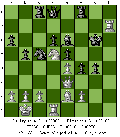 Last move : 1/2-1/2 2021 February 2 16:9:49 [Event "FICGS__CHESS__CLASS_A__000236"] [Site "FICGS"] [Date "2020.08.28"] [Round "1"] [White "Duttagupta,Aniruddha"] [Black "Ploscaru,Stelian"] [Result "1/2-1/2"] [WhiteElo "2090"] [BlackElo "2000"] 1.e4 c5 2.Nf3 d6 3.d4 cxd4 4.Nxd4 Nf6 5.Nc3 a6 6.h3 e5 7.Nde2 h5 8.Bg5 Be6 9.Bxf6 Qxf6 10.Nd5 Qd8 11.Qd3 Nd7 12.O-O-O g6 13.Kb1 Nc5 14.Qf3 Bg7 15.Nec3 b5 16.Ne3 Rc8 17.h4 O-O 18.Ncd5 Bh6 19.Be2 Kg7 20.g4 Bxe3 21.Qxe3 hxg4 22.h5 f5 23.hxg6 f4 24.Rh7+ Kxg6 1/2-1/2 Follow this game move after move (download)I like the moment when I break a man's ego. (Bobby Fischer) Ich würde mich als ganz normalen Jungen bezeichnen [Im Alter von 12]. (Sergej Karjakin) Cuando tengas duda... ¡juega al Ajedrez!. (Tevis) Tous ces prétendus hommes politiques sont les pions, les Cavaliers, les Tours ou les Fous d'une partie d'échecs qui se jouera tant qu'un hasard ne renversera pas l'échiquier. (Honoré de Balzac) I just play for fun. (Anna Kournikova)